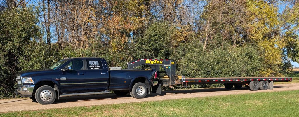 *Our fleet currently consists of: one Class 3 Cummings HD Turbo Dodge Ram Dually 3500, Longhorn crew cab, pick-up truck; and one 32′ straight-deck/deck-over flatbed gooseneck, 7k dual-axel, trailer.*